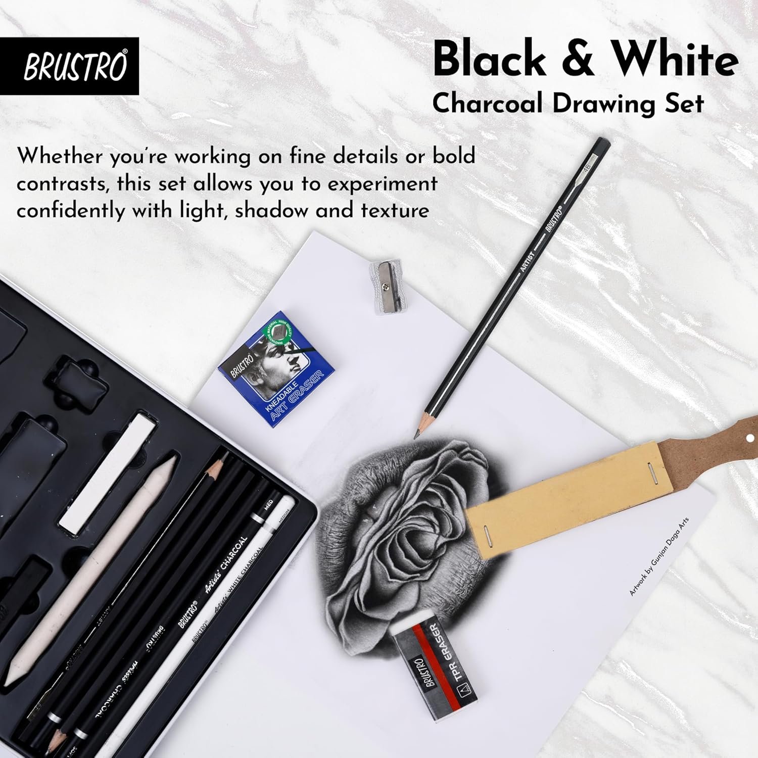 • Complete Charcoal Drawing Kit (Set of 13 Pcs): A carefully curated selection of charcoal and graphite tools for versatile black & white artwork