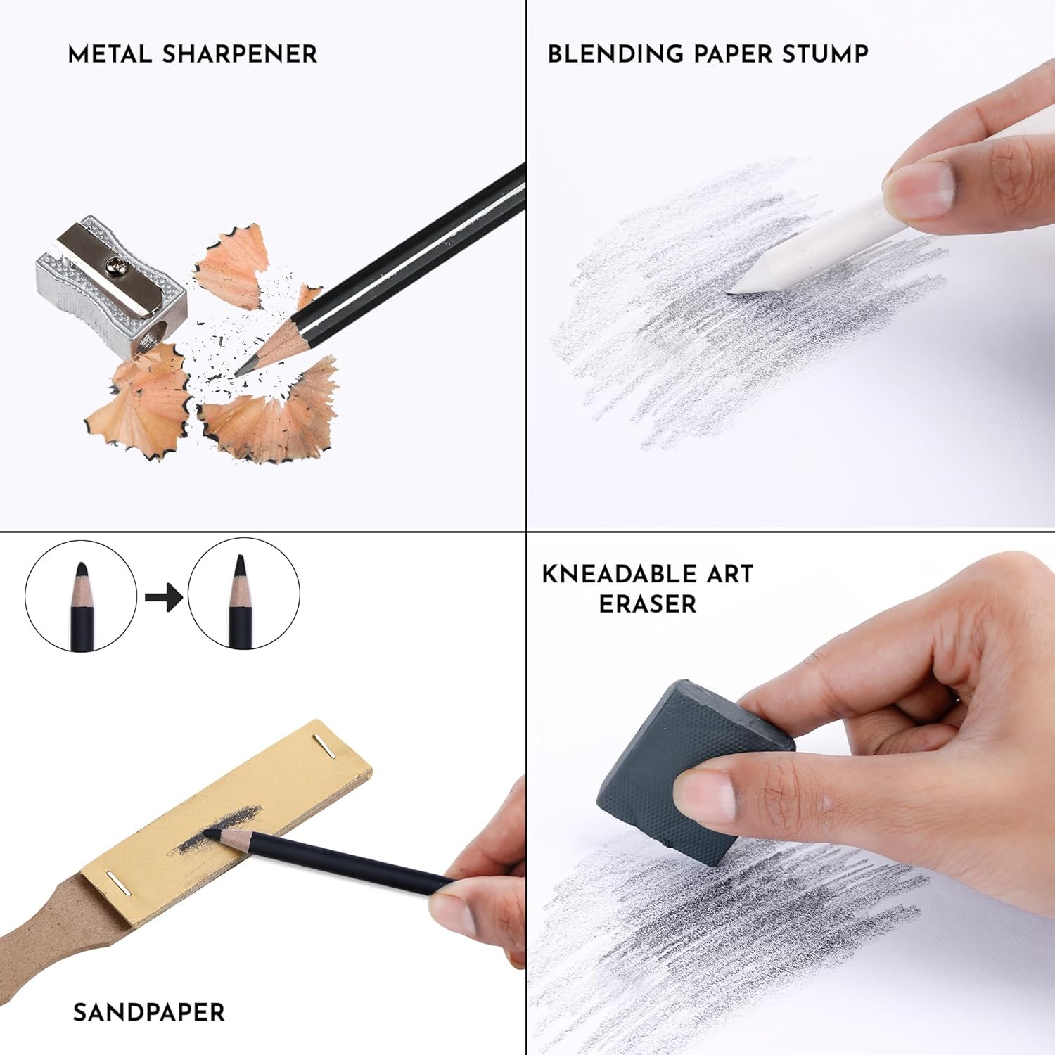 • Additional Accessories: 1 TPR Eraser, 1 Single Hole Metal Sharpener, 10 Sheets of Sand Paper