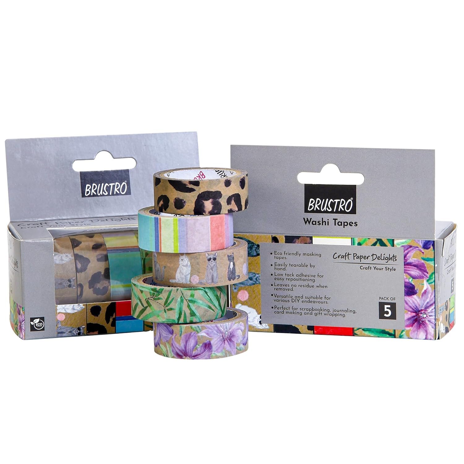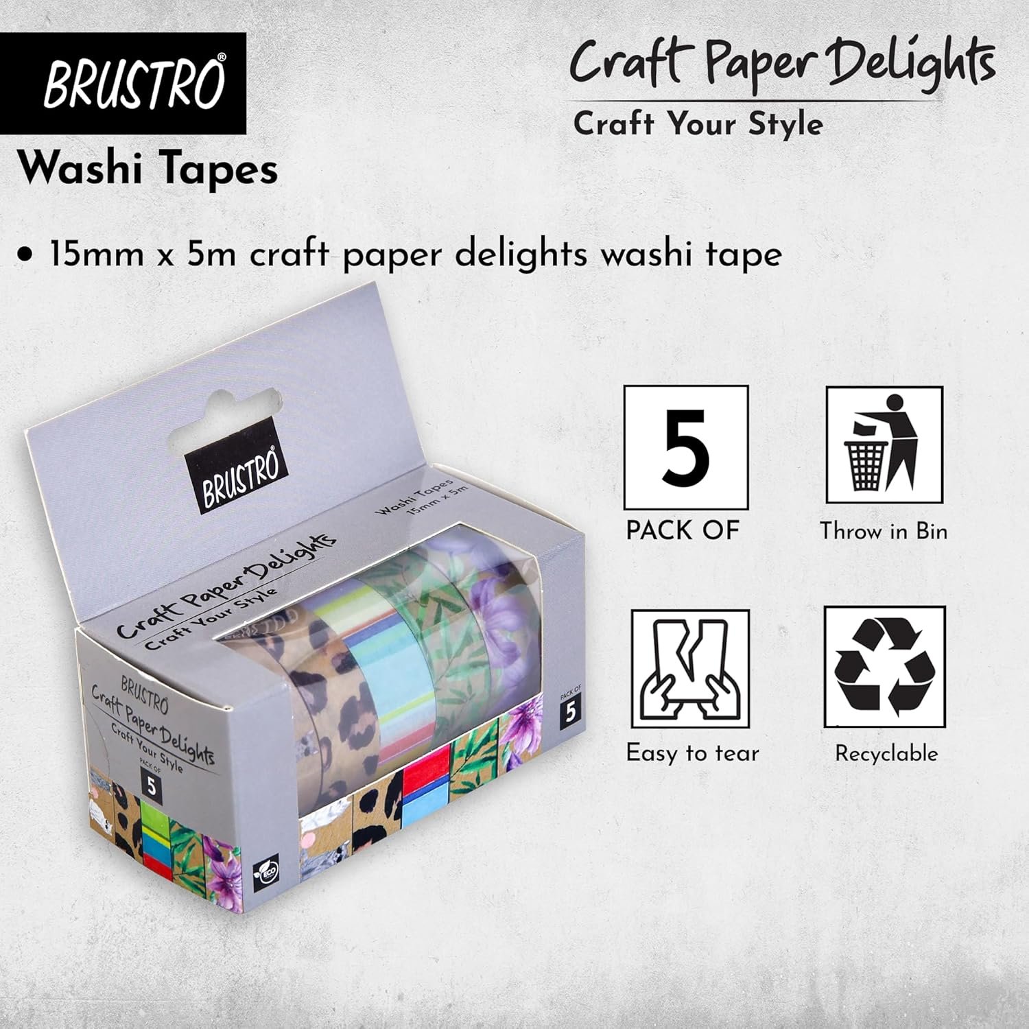 BRUSTRO Craft Paper Delights Washi Tapes (15mm x 5m), Pack of 5 | Low Tack Adhesive