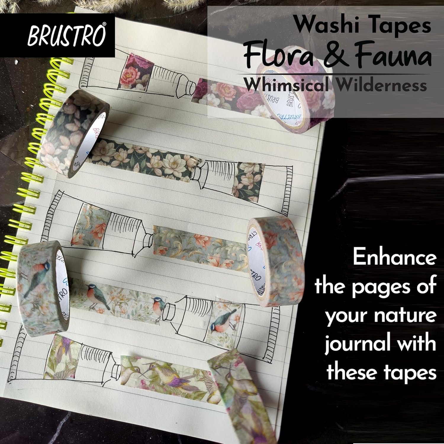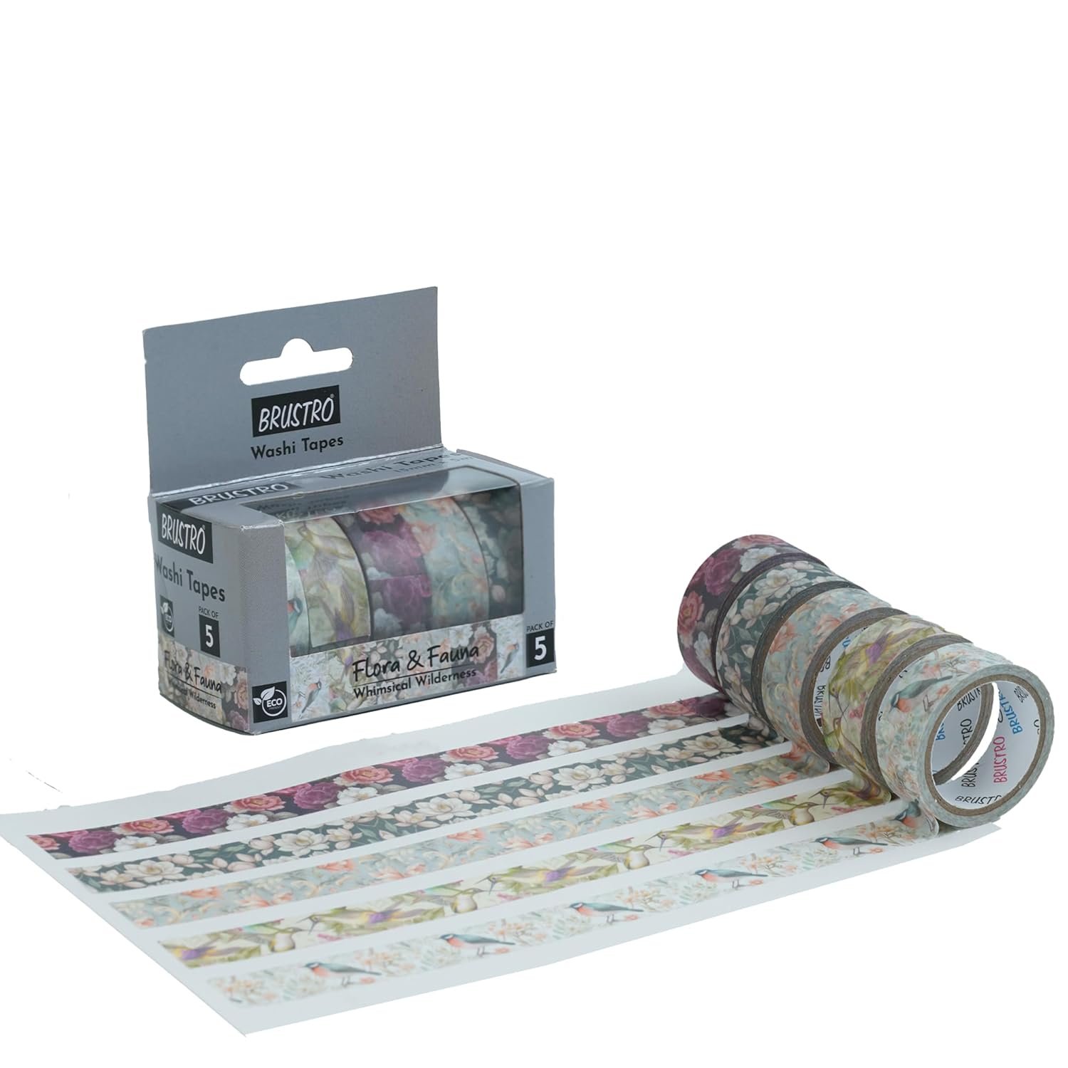 BRUSTRO Washi Masking Tapes |Flora and Fauna Shade|15 mm x 5 mtrs (Set of 5)| Low Tack Adhesive