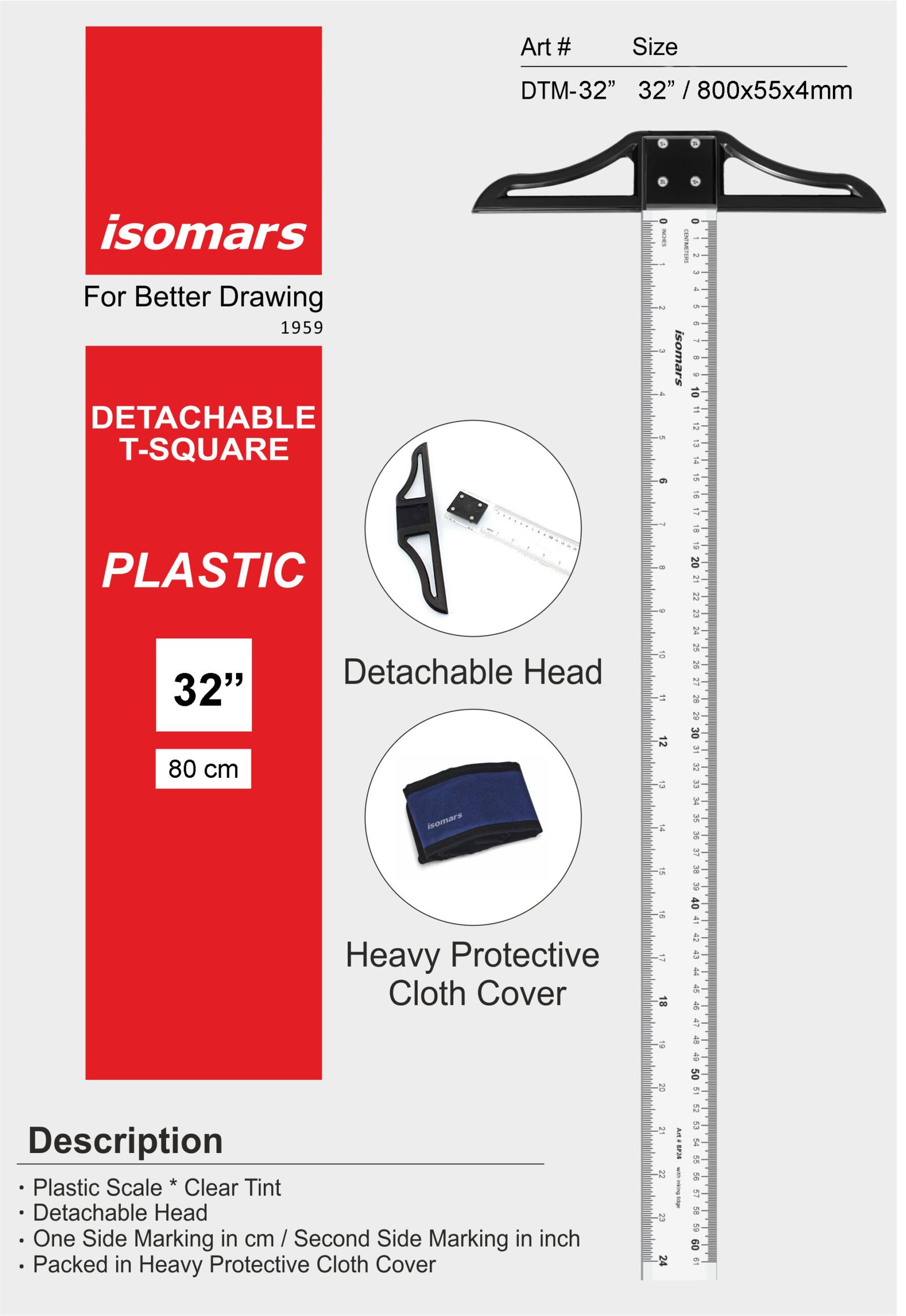 Isomars T- Square Detachable 32" is a T shaped tool used to draw parallel lines and right angles. It is a clear acrylic scale with opaque plastic detachable head . Has both side markings (mm/inch)