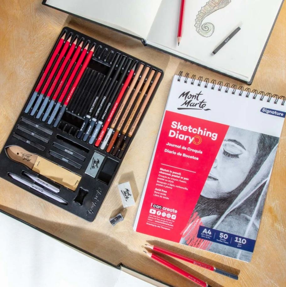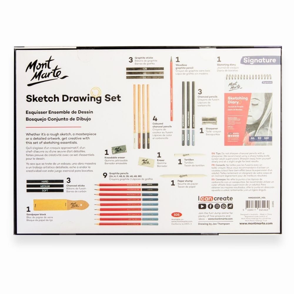 Explore drawing with this all-in-one Sketch Drawing Set Signature 30pc. Packed with all the creative tools you need to experiment with dry media; draw and sketch with the pencils and charcoal and refine using the blenders and erasers. From drawing details to shading large areas, discover illustration, portraiture, landscape, lettering, and other dry media art. This set is great to kick-start your collection, stock up on supplies, or gift to a creative mind.